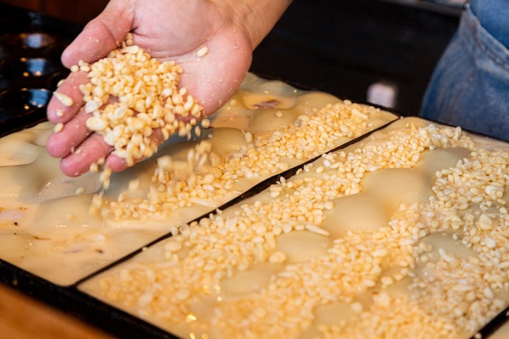 たこ焼きは生地の味にこだわり、出汁をその日の朝に仕込んでいます。改良を重ねた独自の配合でフワっと軽い食感に。また、銅板で焼くことでじっくり熱が通り、より上品で優しい食感に焼き上がります。中の具は、真ダコを5g使用。贅沢で食べ応えのあるたこ焼きに仕上げました。
